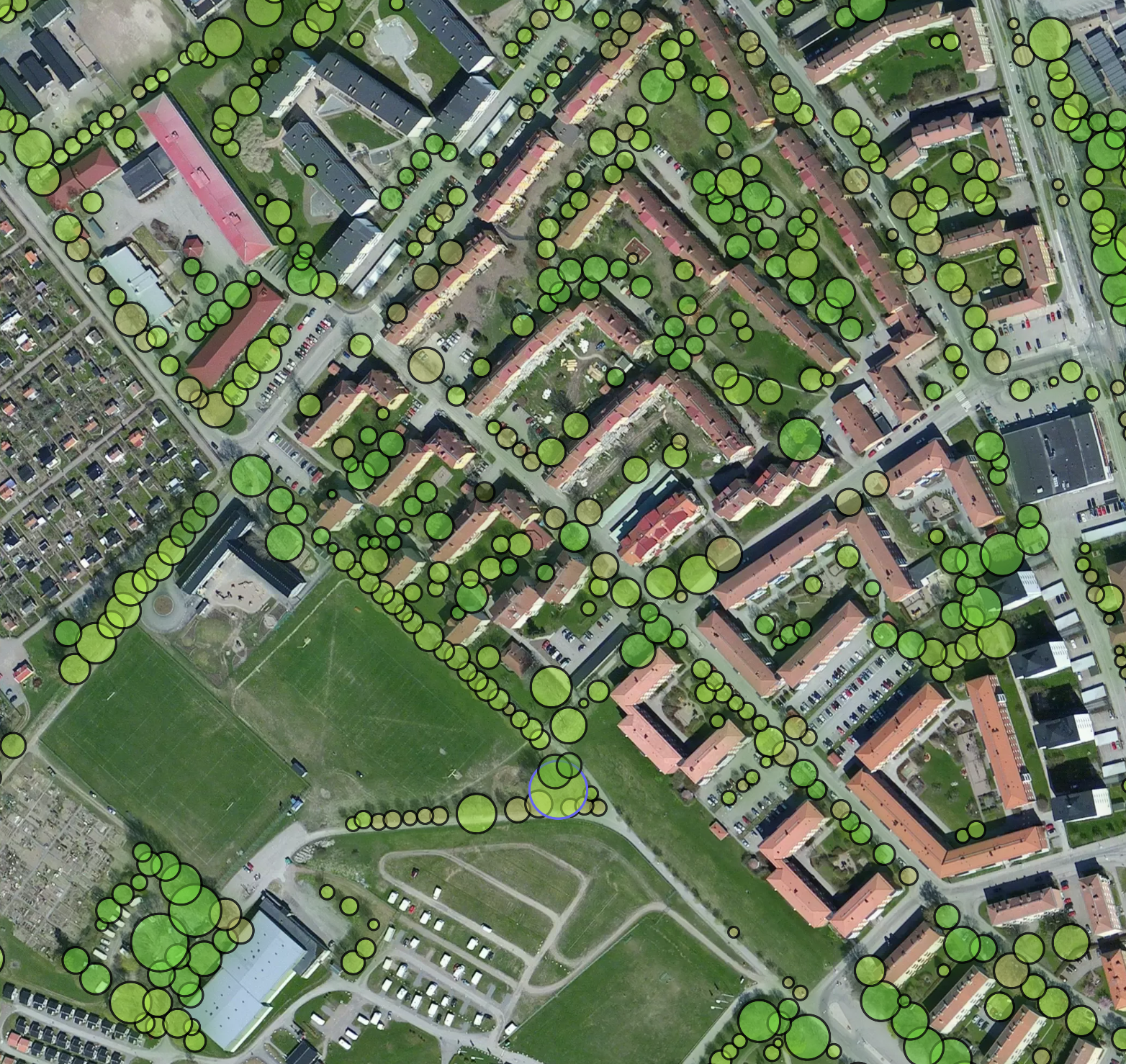 För att förstå trädens betydelse i staden behöver vi får en överblick över stadens alla träd - inte bara träd i parker, eller utmed gator. Först då kan vi se hur träd bidrar till ekosystemtjänster och hur de ingår i grön infrastruktur. Appen laddas från start med stadens alla träd kartlagda med laserdata. Andra källor, som trädinmätningar och inventeringar, kan sedan läggas till.
