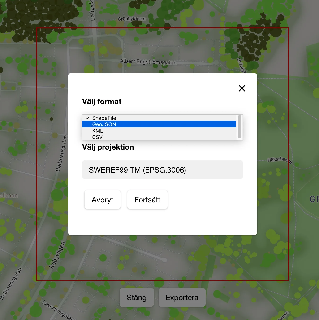 Appen är en ny startpunkt när man arbetar med stadens träd. I appen kan du hämta hem data så du kan fördjupa din egen analys, din skiss eller ritning. Som arkitekt kan du ladda ned trädpunkter med attribut och position för att fortsätta att arbeta i CAD. Som planerare kan du ladda ned data för att fortsätta arbeta i GIS. Du får en grundplåt till ditt nästa fältbesök som arborist eller konsulterande ekolog. Väljs projektion och format. Så enkelt är det.